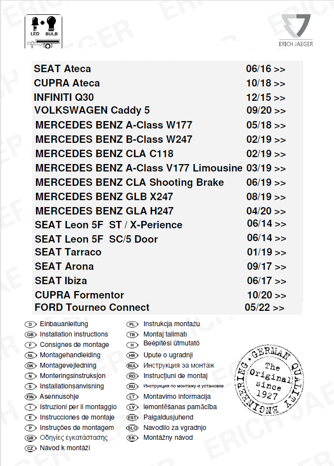 SEAT Ateca 06/16 >> CUPRA Ateca 10/18 >> INFINITI Q30 12/15 >> VOLKSWAGEN Caddy 5 09/20 >> MERCEDES BENZ A-Class W177 05/18 >> MERCEDES BENZ B-Class W247 02/19 >> MERCEDES BENZ CLA C118 02/19 >> MERCEDES BENZ A-Class V177 Limousine 03/19 >> MERCEDES BENZ CLA Shooting Brake 06/19 >> MERCEDES BENZ GLB X247 08/19 >> MERCEDES BENZ GLA H247 04/20 >> SEAT Leon 5F ST / X-Perience 06/14 >> SEAT Leon 5F SC/5 Door 06/14 >> SEAT Tarraco 01/19 >> SEAT Arona 09/17 >> SEAT Ibiza 06/17 >> CUPRA Formentor 10/20 >> FORD Tourneo Connect 05/22 >>